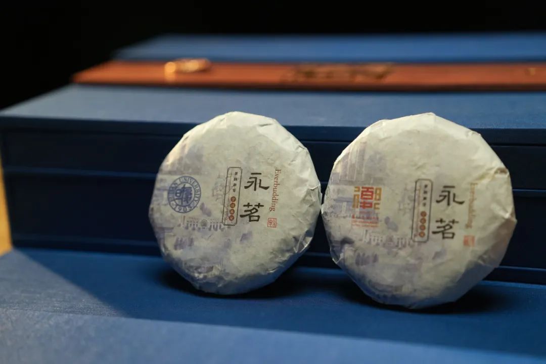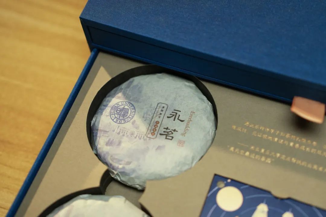 两块名为“永茗”的60克茶砖,拼成复旦“120”周年意象。茶叶源自复旦定点帮扶的云南永平县,那里有离天空最近的茶园。