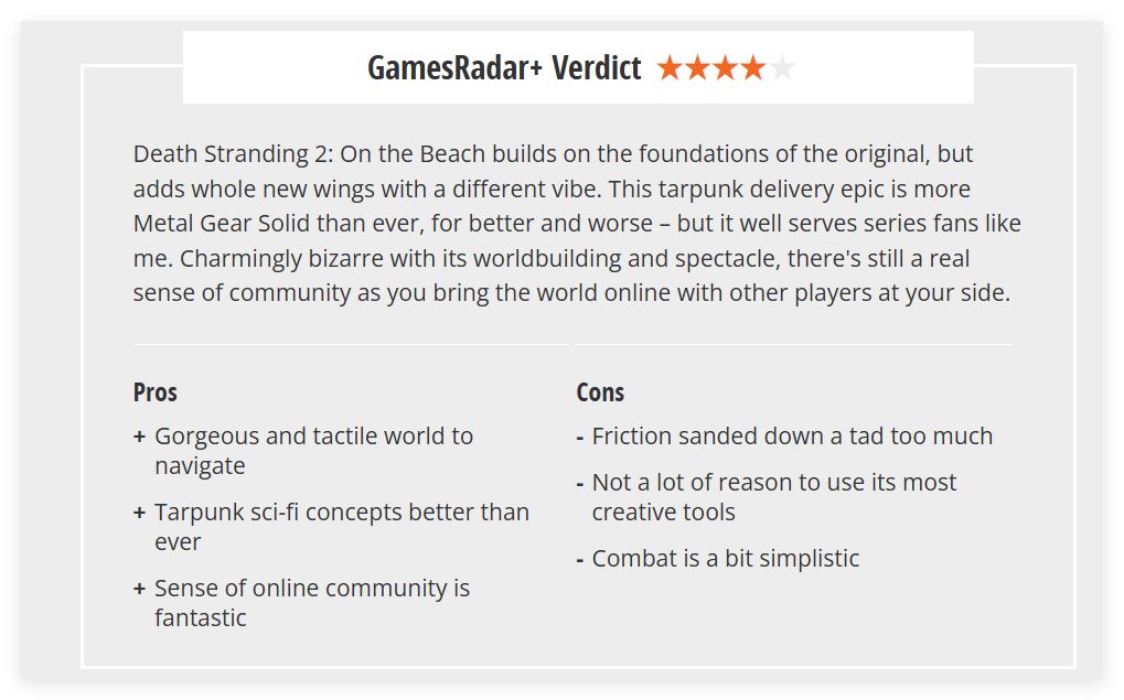 《死亡擱淺2:冥灘之上》堪稱史詩級鉅製,是小島秀夫那部爭議性邪典神作的豪華續章。它呈現更精妙的故事脈絡、更耀眼的角色陣容、更瑰麗的重連世界。這部作品彷彿凝聚了小島脫離科樂美后的全部歷練,無疑是2025年度最傑出的遊戲之一。作爲傳世級的經典續作,它躋身小島秀夫生涯最佳遊戲行列——以震撼的開放世界、大幅拓展的遊戲機制與玩家選擇權、以及小島生涯最具吸引力的角色羣像與敘事張力,幾乎在全方位實現了對前作的超越。