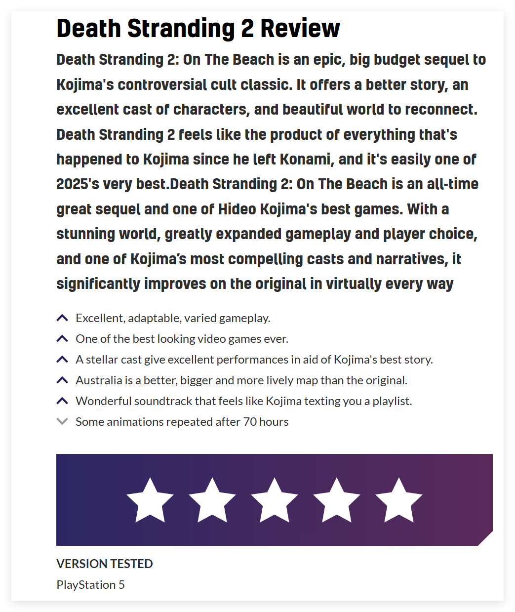 《死亡擱淺2:冥灘之上》媒體評分正式解禁,本作將於 2025 年 6 月 26 日發售,登陸 PS5 平臺。