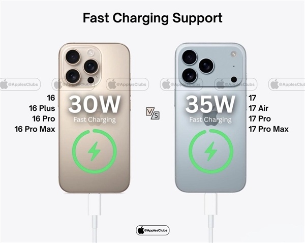 此外,Pro系列标配12GB内存以支持更强大的Al功能,标准版或保留8GB。充电方面,这一代iPhone再次进步了。据悉,iPhone 17全系快充规格从以前的30W可能提升至35W。