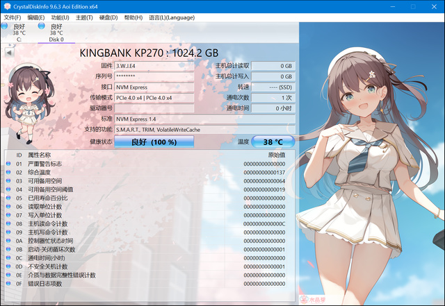 使用 CrystalDiskInfo 读取信息显示KINGBANK KP270 固态硬盘容量为 1024.2 GB,固件版本为 3.W.J.E4,采用 NVMe(NVM Express)接口与 PCIe 4.0 x4 传输模式,符合 NVM Express 1.4 标准,并支持包括 S.M.A.R.T.、TRIM 和 VolatileWriteCache 在内的多种功能。