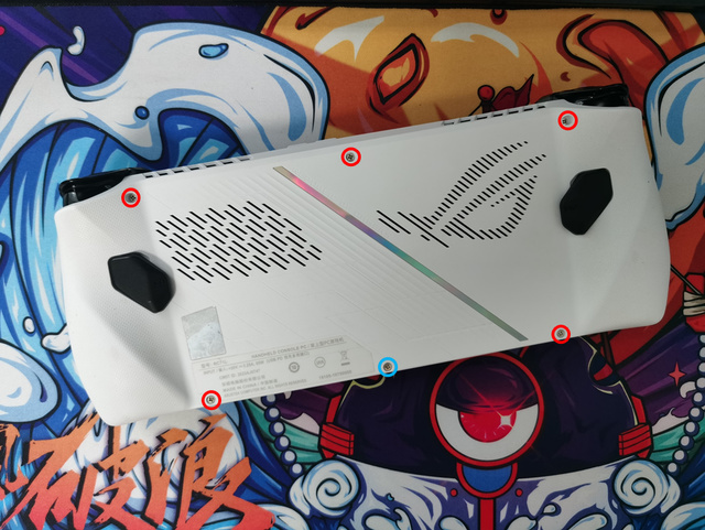 在拆解ROG Ally掌机背面时,请严格遵循以下螺丝拆卸顺序以确保安全:首先拧下周围均匀分布的五颗螺丝(以红色圆圈明确标记),作为初步解锁步骤;紧接着,作为最后一步,轻轻拧下位于中央底部、具有特殊固定作用的螺丝(特别以蓝色圆圈标注)。务必严格遵守此顺序,以安全移除ROG Ally掌机的后壳。