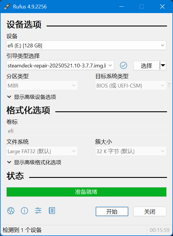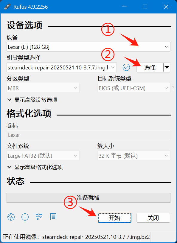打开 Rufus 工具后,首先在设备选项中选择你的 U 盘(如图中标注①所示),然后点击“选择”按钮并找到你下载好的 Steam OS 镜像文件(如图中标注②所示)。确认无误后,点击“开始”按钮(如图中标注③所示)将Steam OS 镜像文件写入 U 盘。