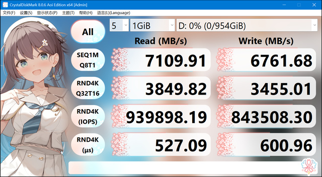 使用 CrystalDiskMark 进行测试,结果显示这款固态硬盘在 1GB 测试数据下的性能表现优异。顺序读取速度达到 7109.91 MB/s,顺序写入速度为 6761.68 MB/s,这一成绩与官方宣传的数值基本一致。