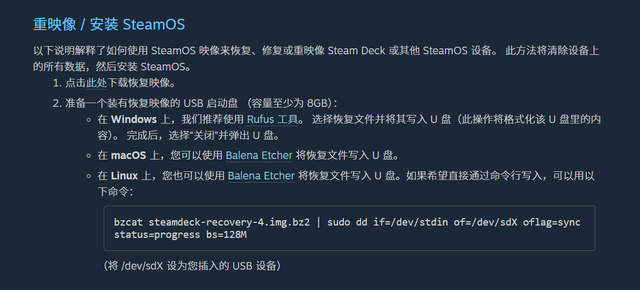 根据自己的操作系统来下载对应的镜像写入工具:Windows 用户推荐使用 Rufus,macOS 或 Linux 用户则可选择 BalenaEtcher,以便后续将 SteamOS 镜像写入 U 盘进行系统安装。
