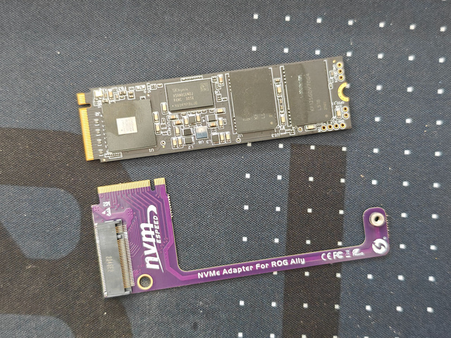 组装完成后,就可以将新的硬盘安装到ROG Ally掌机中了(Tips:安装时请确保转接卡与固态硬盘的连接牢固)。