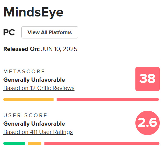 Steam平台用户评价同样惨淡,1833篇评测中仅37%为好评。游戏副总监Adam Whiting曾在发售前向VGC透露,尽管工作室同步开发《无处不在》与《心之眼》,但"大部分团队始终聚焦后者",强调"这种品质与规模的作品需要大量美术、程序等各领域人才投入,更需要倾注心血"。