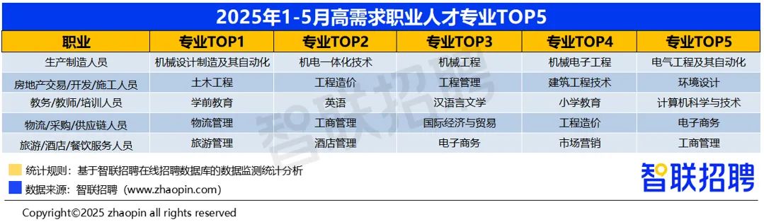 生产制造、房地产等职业当前招聘需求领先(如智联招聘TOP10),专业对口(如机械工程、土木工程)仍是就业关键优势;产业升级和政策调整驱动需求,提醒考生结合宏观环境选择专业以降低就业难度。