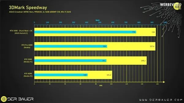 华硕RTX 5090 Astral LC显卡本身已经具备出色的性能和液冷散热设计,出厂状态下,显卡在满载时运行在600W,在3DMark Speedway中提供约146FPS,核心频率接近2800 MHz,显存频率为1750 MHz。