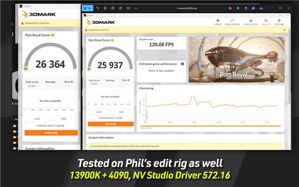 另一套i9-12900K、RTX 4090组成的“老平台”上,Port Royal跑分也从25937提高到26364,提升幅度约2%。