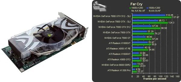 尽管没有架构上的大幅革新,7800 GTX的表现依然可圈可点,图形性能达到了上代的两倍,浮点算力是奔腾4 3GHz处理器的几乎14倍,让对手ATI疲于应付。