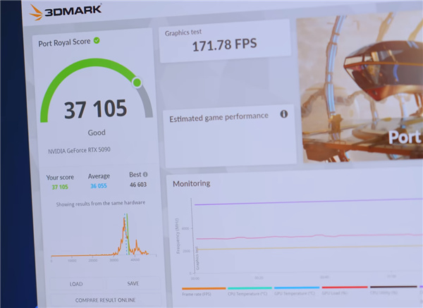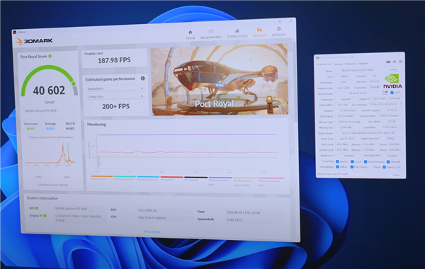 博主在自己的i9-14900KS、RTX 5090平台上测试,Resizable BAR开启前3DMark Port Royal跑分为37105,开启后提高到了40409,最高40602,提升幅度9.4%。