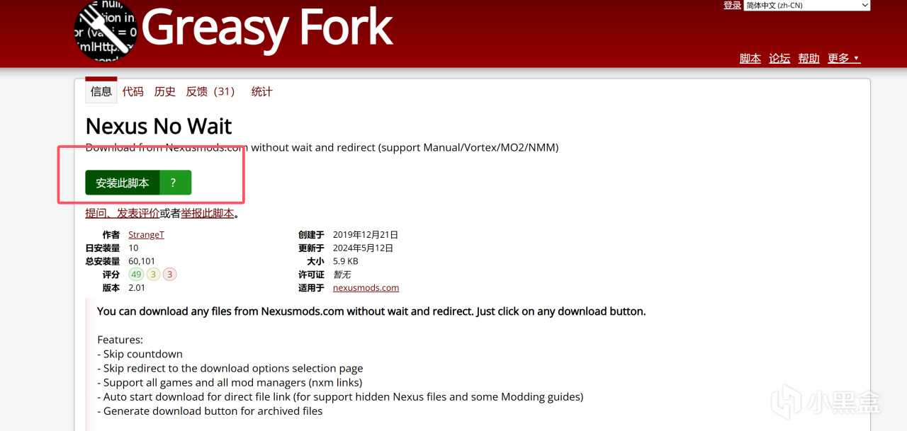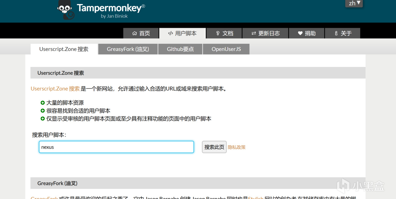 安裝完成後同樣找到“擴展”,點擊油猴插件,點擊獲取新腳本,之後會自動跳轉到腳本網站,在網站的搜索框裏輸入“Nexus”,點擊搜索會自動跳出結果頁面,