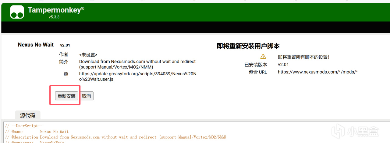 點擊腳本跳轉到安裝頁面,點擊安裝腳本(我以及下載了所以會顯示重新安裝),他會自動下載安裝到油猴內,安裝完畢後這個腳本就默認開啓了。