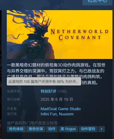 而最近有這麼款遊戲,同樣是魂系要素+肉鴿的玩法,一舉拿下了88%的好評——甚至比《黑夜君臨》還要高!(雖然遊戲也相當冷門就是了)省流來說,它其實就是款略帶點魂味的哈迪斯like。