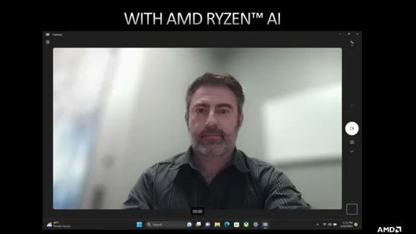 比如在Windows相机或其他视频会议软件中,系统可以直接调用锐龙AI引擎,识别前景、人物和背景,进行背景虚化、自动取景和眼神交流等操作,显著增强体验,并大大降低功耗。