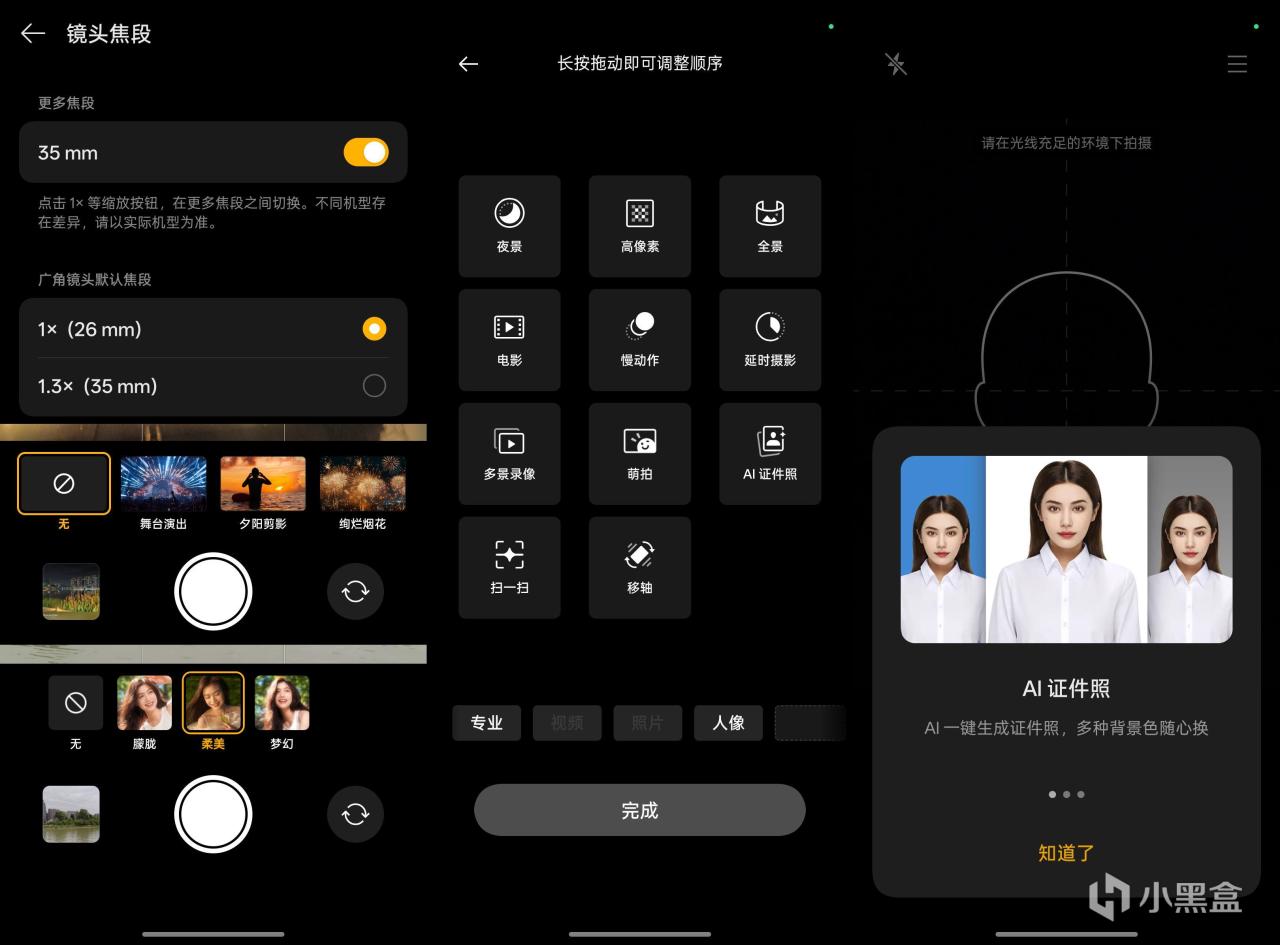 除了常规的照片、视频、专业、人像模式外,还有夜景、高像素、全景、电影、慢动作、延时摄影、多景录像、萌拍、AI证件照、扫一扫和移轴模式。