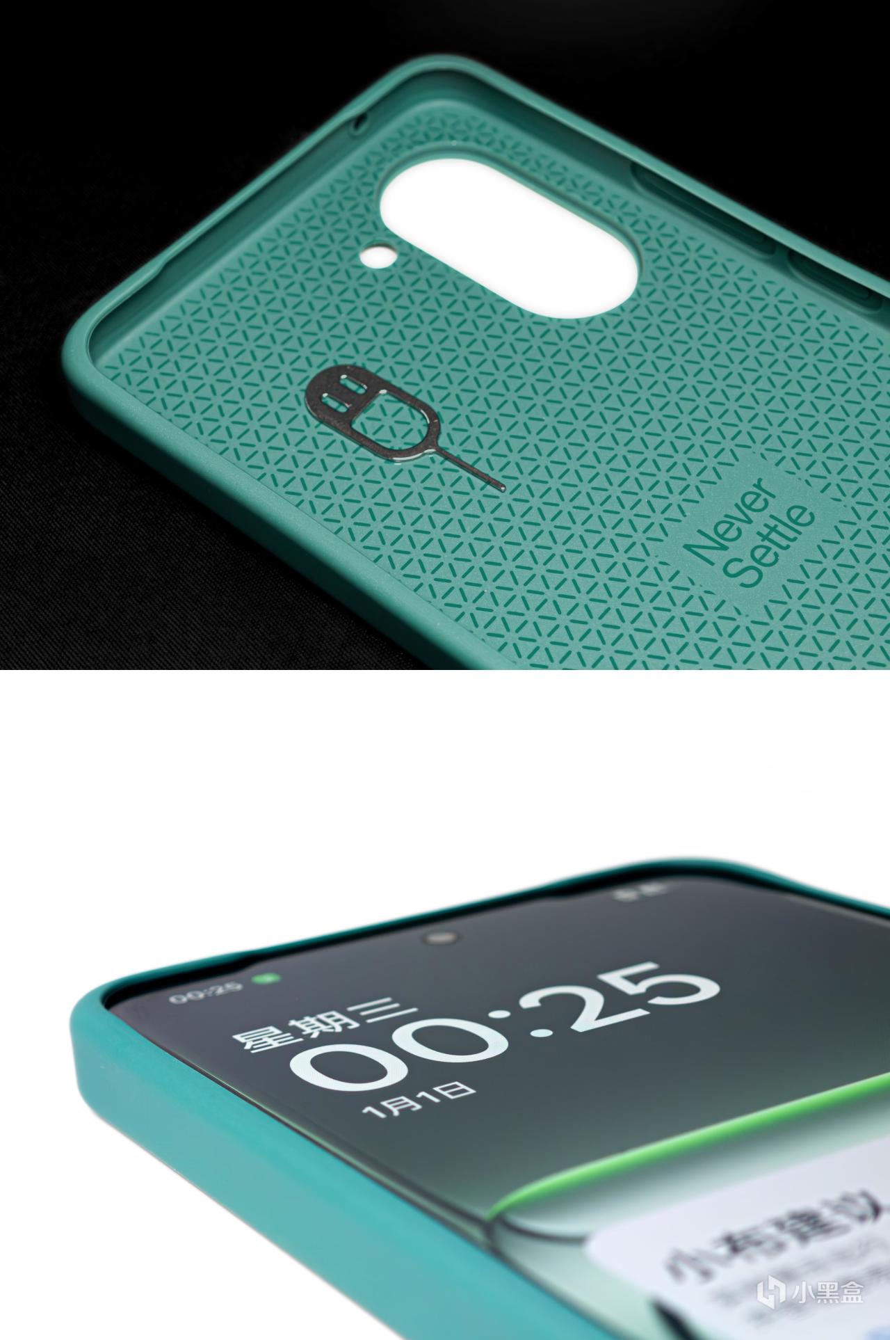 旷野绿的一加Ace 5竞速版配了深绿色的手机壳,背面一加“1+”logo处还做了凸出处理,内衬面则有“Never Settle”字样,正面四角凸起保护屏幕。卡针也是主流厂商中为数不多还在做定制有特色的。