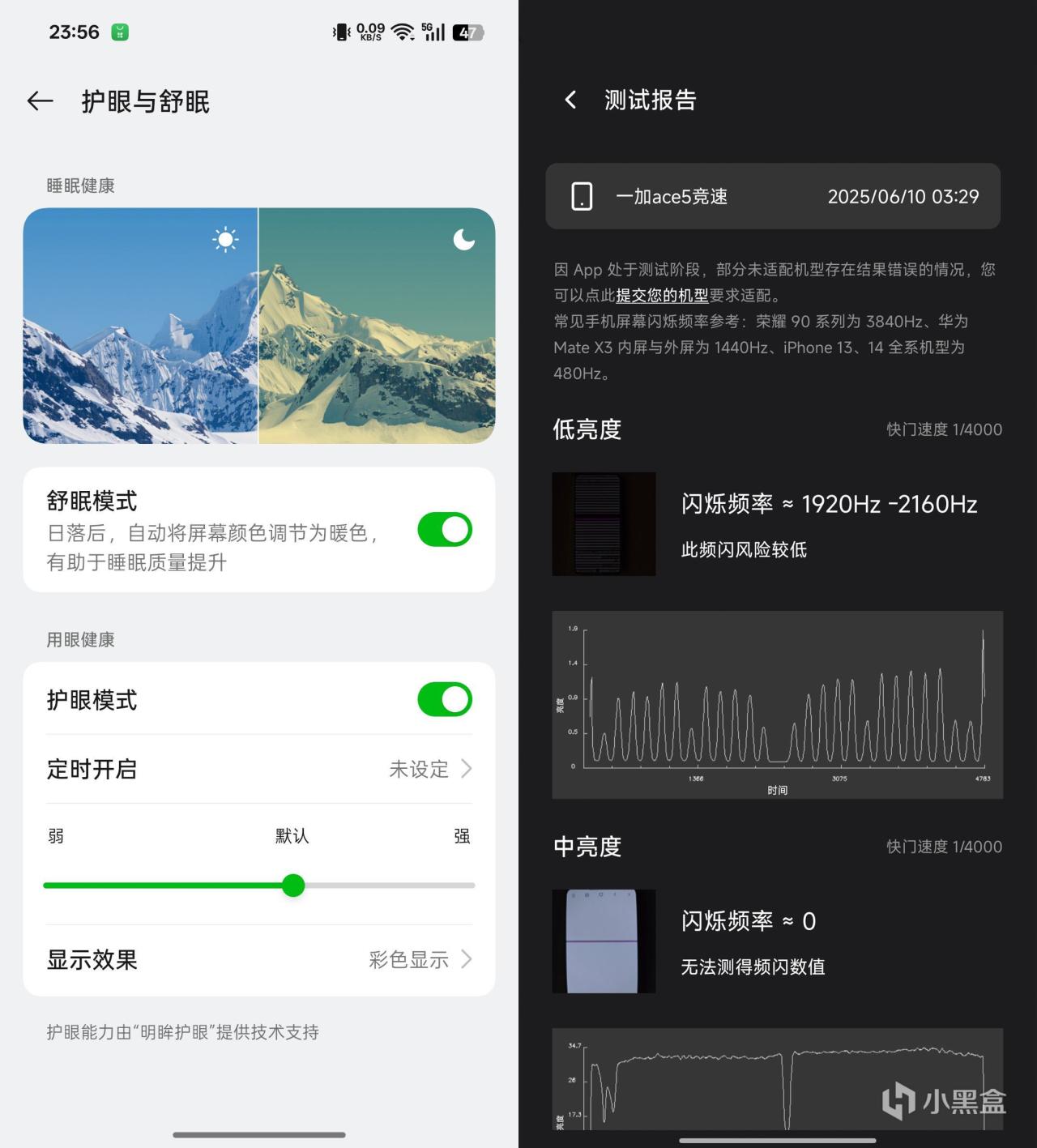 护眼方面,一加Ace 5竞速版在三分之一亮度以下为2160Hz高频PWM调光,以上则为低SVM 1Pulse DC调光,支持舒眠模式和护眼模式。