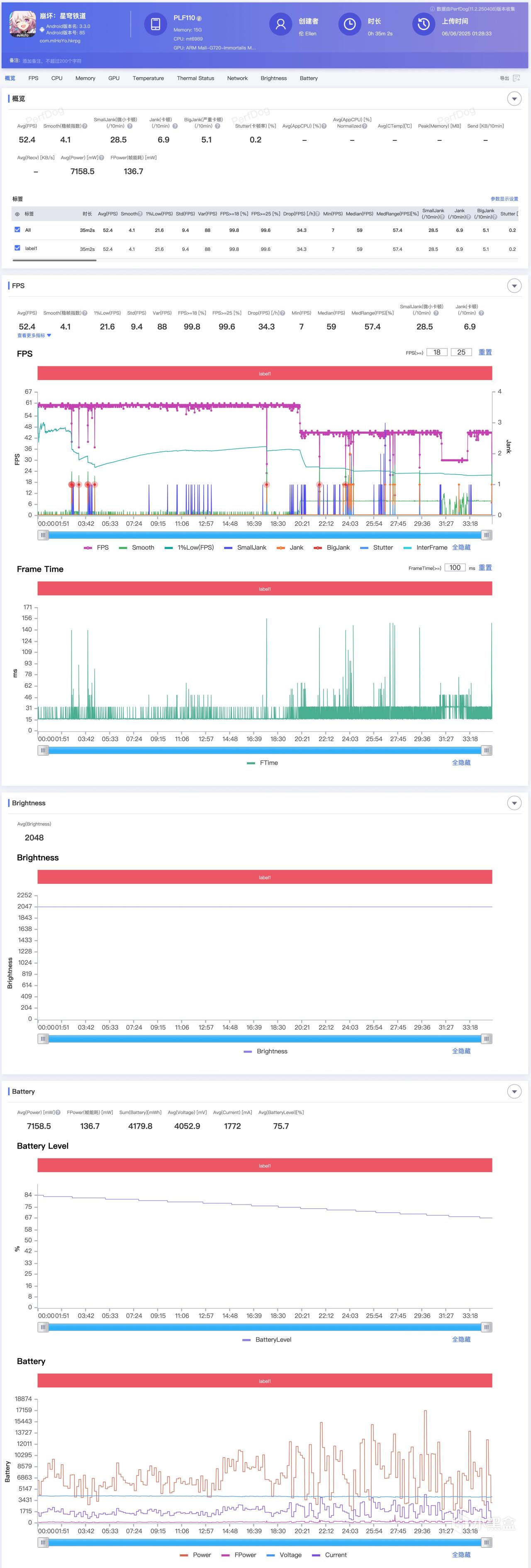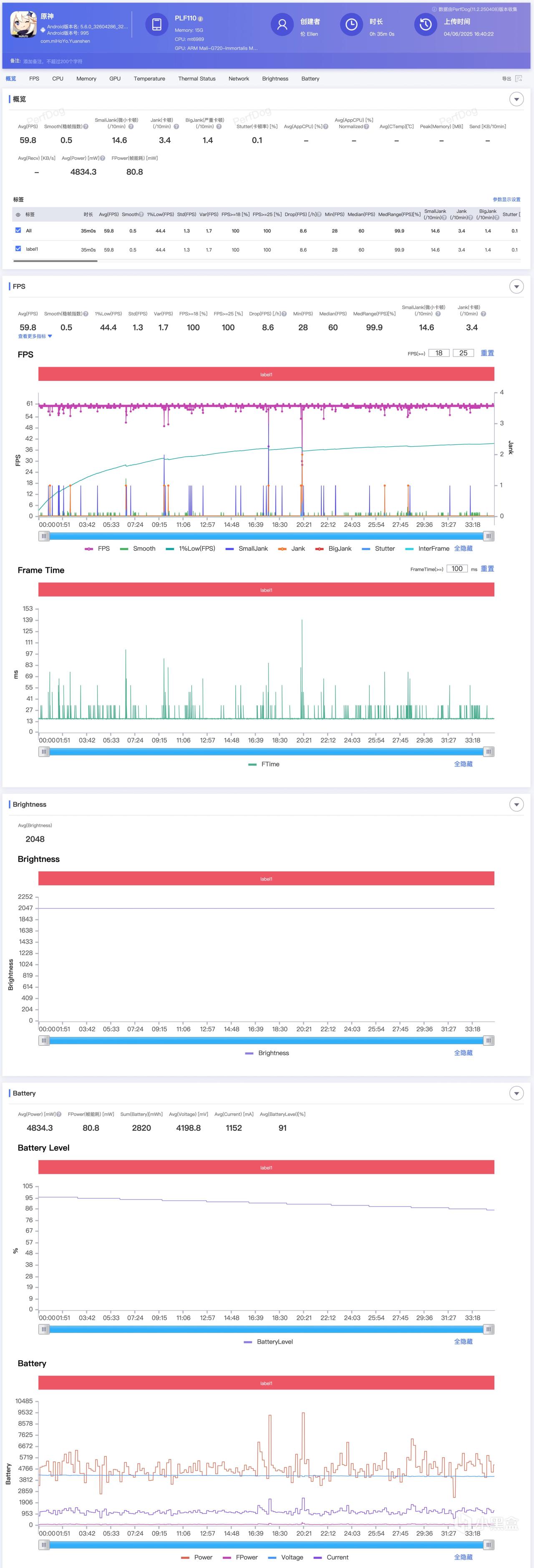 原神60帧全高35分钟,平均帧率59.8,平均功耗4.83W,未发现降亮度现象。