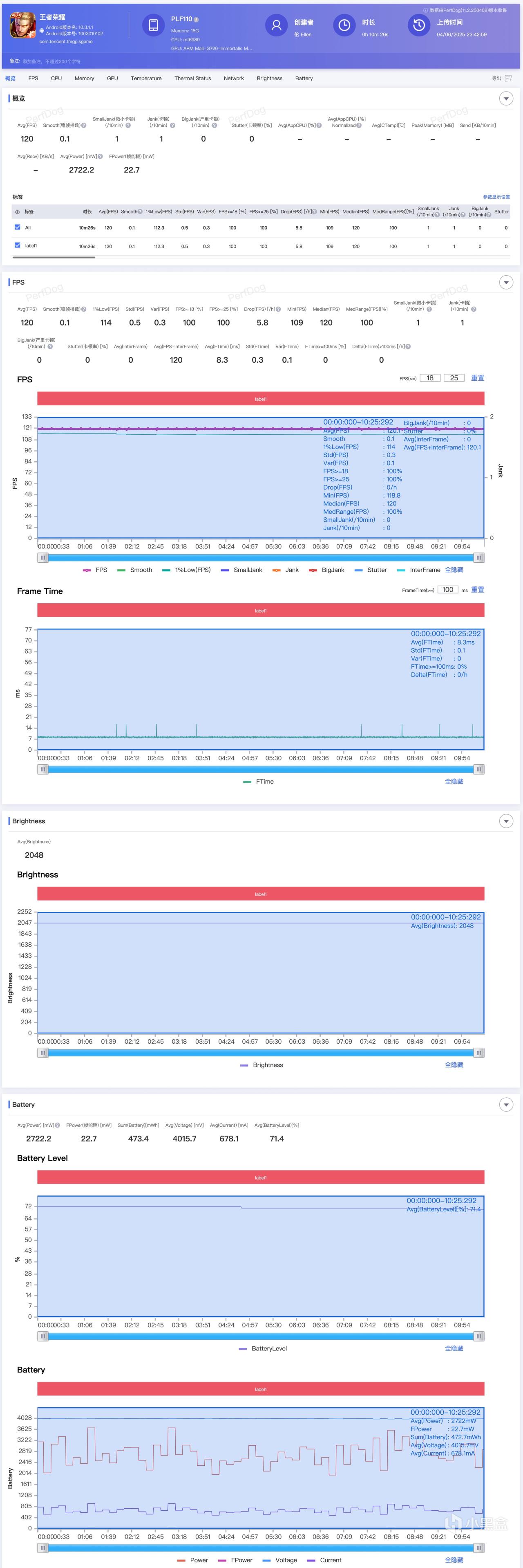 先上国民手游王者荣耀,极高帧率超高分辨率极致画质下,单局内10分钟平均功耗仅2.72W,平均帧率120,未发现降亮度,1% Low帧114,基本也是旗舰水平了。