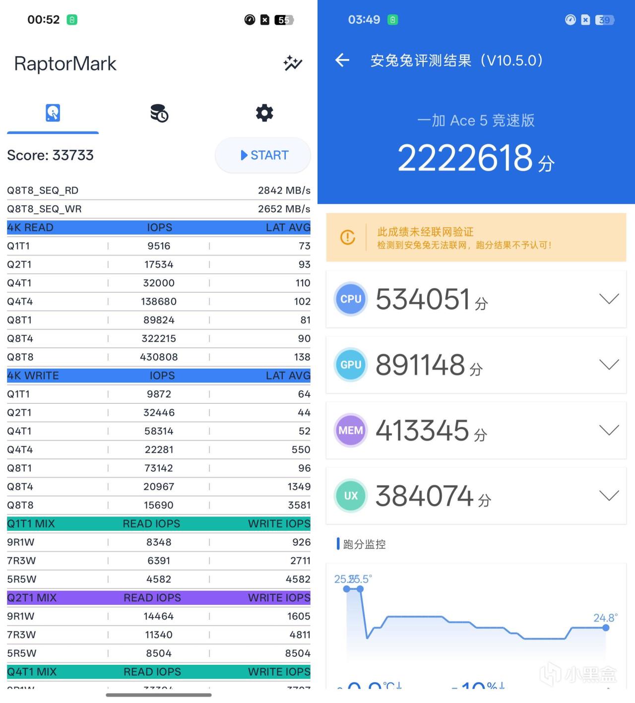 闪存使用新版RaptorMark实测顺序读取最高2842MB/s,顺序写入最高2652MB/s,得分33733,相比我手头的iQOO Z10 Turbo高出7000多分。