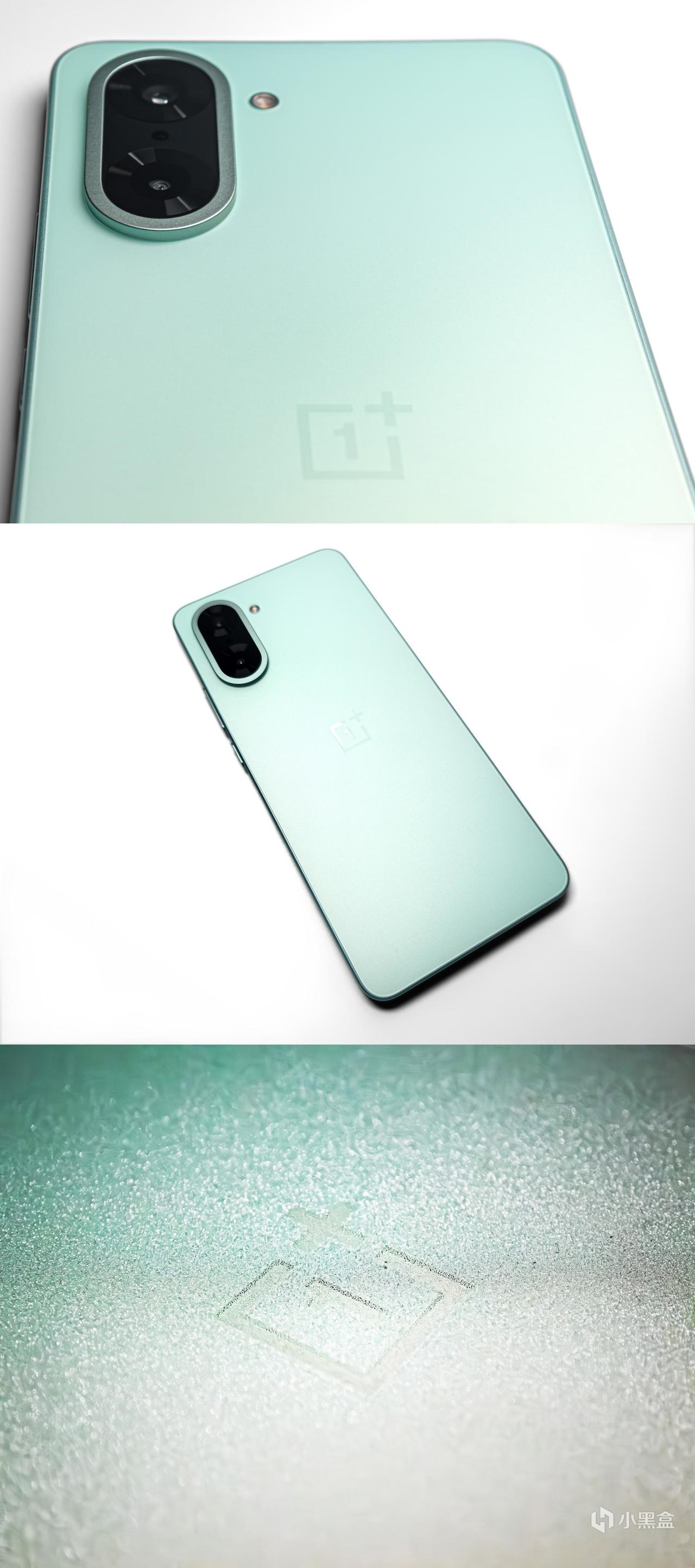 翻到背面,旷野绿的相对低饱和配色有种夏日清凉感,小清新而又不至于扎眼,虽然是塑料材质后盖,但处理的还是比较精致的,雾面磨砂不沾指纹,单独处理的“1+“Logo在不同光线下呈现出不同的反射效果。