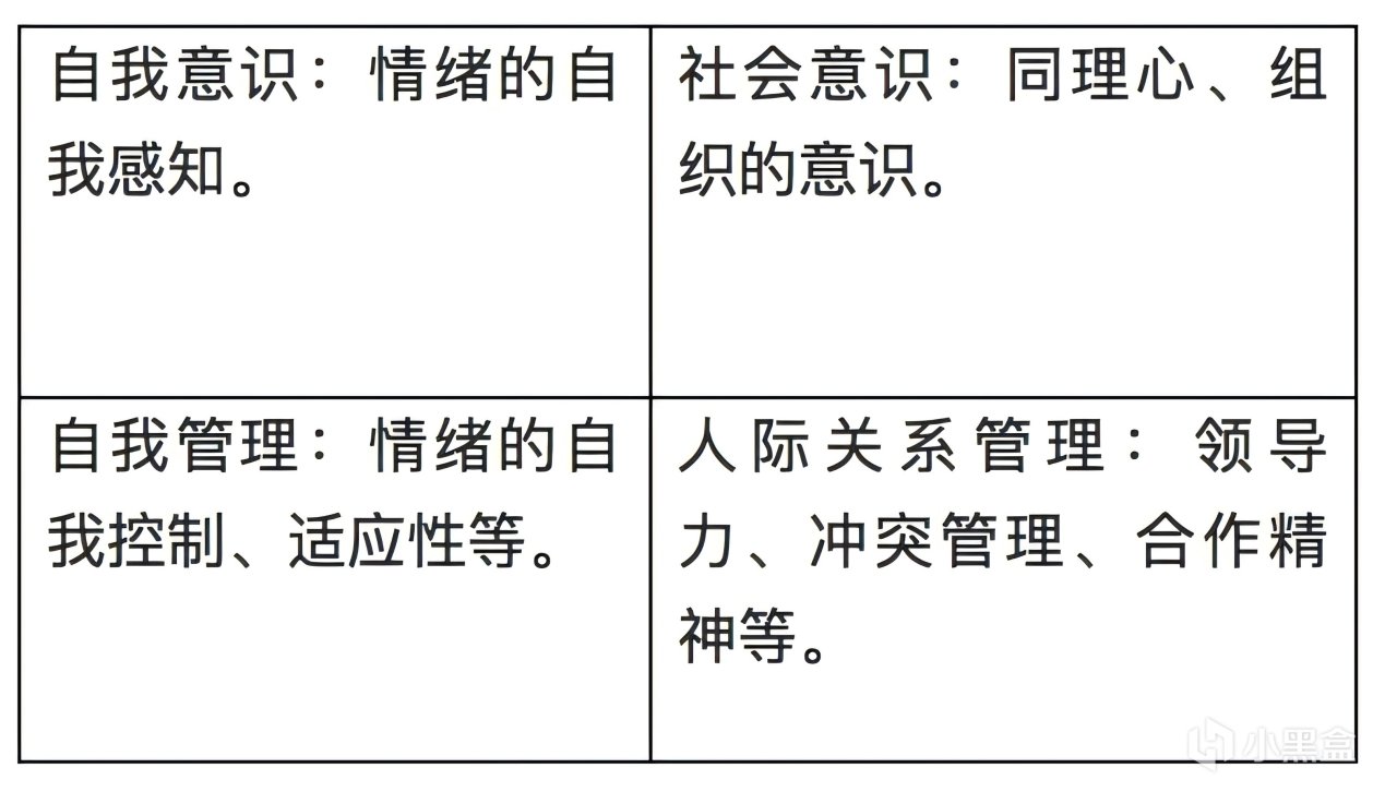 它分爲自我意識、自我管理、社會意識和人際關係管理四個部分