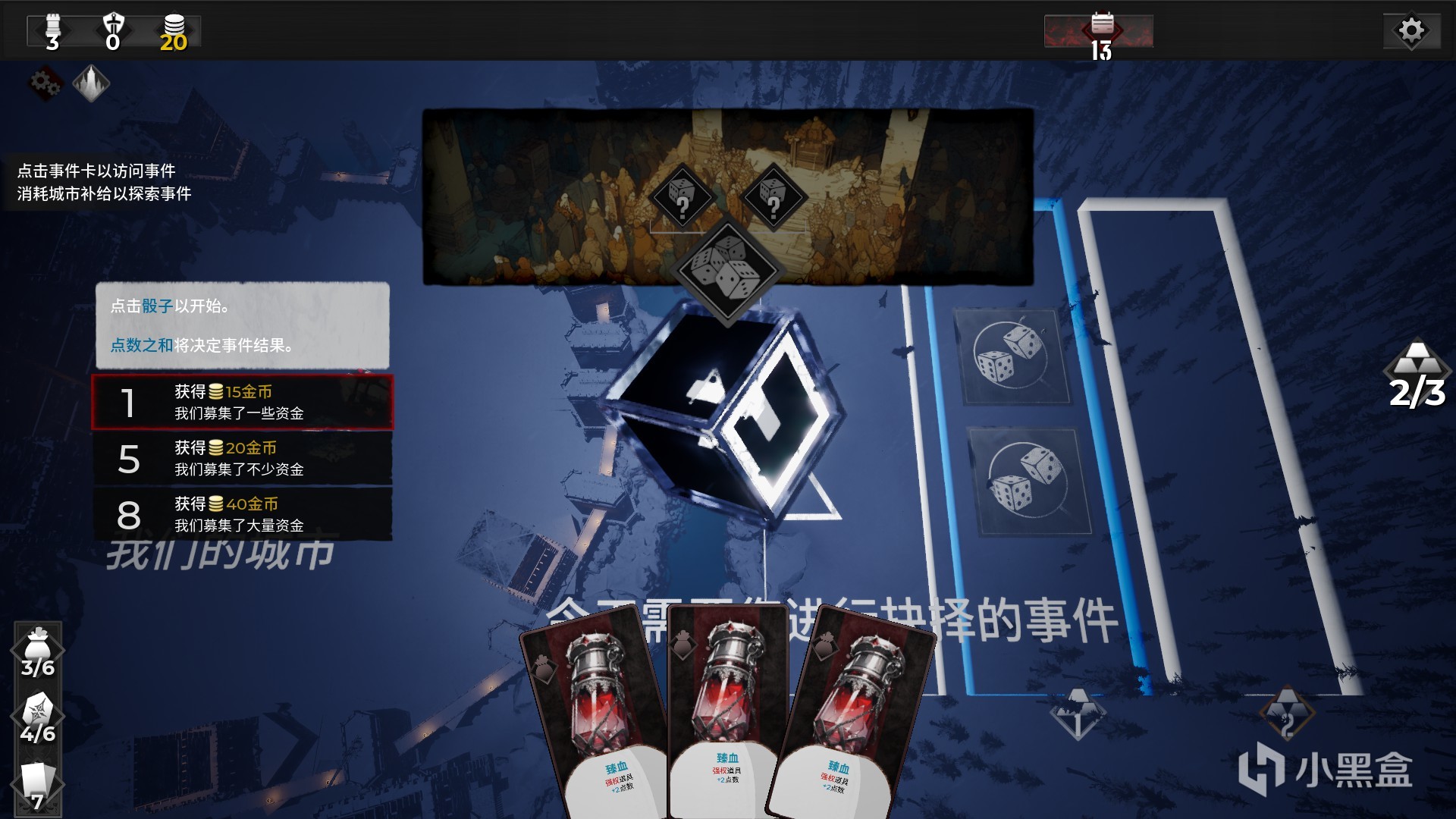 随机事件除了消耗道具还有另外一种掷骰子的参与方式。根据我们的选择不同,骰子需要掷出对应大的点数。需要的点数越大,自然我们的收益越高。如果掷出的点数不足,自然收益也会降低。不过我们可以通过左下角的可消耗道具来提高自己的点数,道具不同增加的点数自然也是不同。