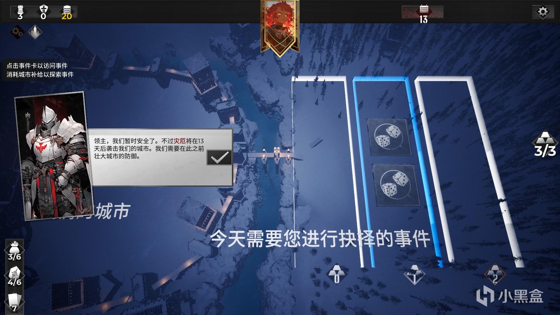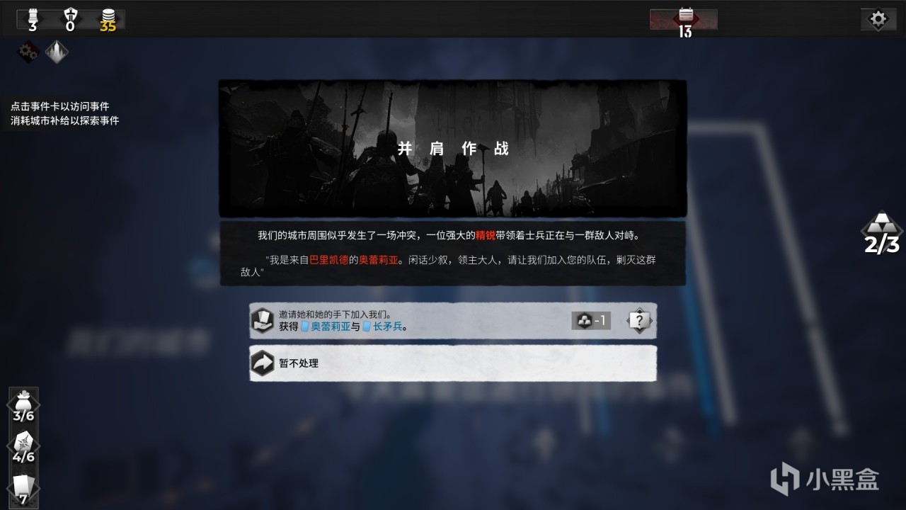 战斗并不是只体现在前线之上,战斗结束我们还会迎来各种随机事件。我们同样拥有三点行动点数,我们可以随意选择各种事件进行完成。例如增强我们的防御建筑,获得各种道具和救助居民等。有的事件选择除了消耗行动点数,还会消耗各种道具和金币。这些事件在一定程度上也颇具思考,真实性增加了不少。另外随机事件中还会有商店出现,我们可以在商店升级和删除卡牌,或者是购买卡牌等。
