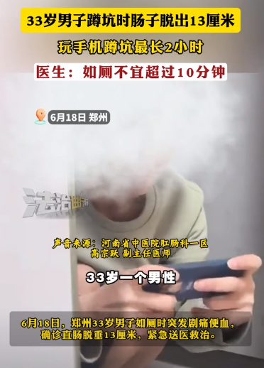 在住院治疗期间,医生询问病史得知,该男子长期蹲坑,期间还会拿着手机刷视频,最长能有2个多小时。