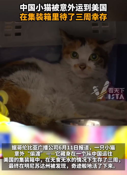 据哥伦比亚广播公司报道,近日,一只小猫意外“偷渡”——它藏身在一个从中国运往美国的集装箱中,在无食无水的情况下生存了三周,最终在明尼苏达州被发现,奇迹般地活了下来。