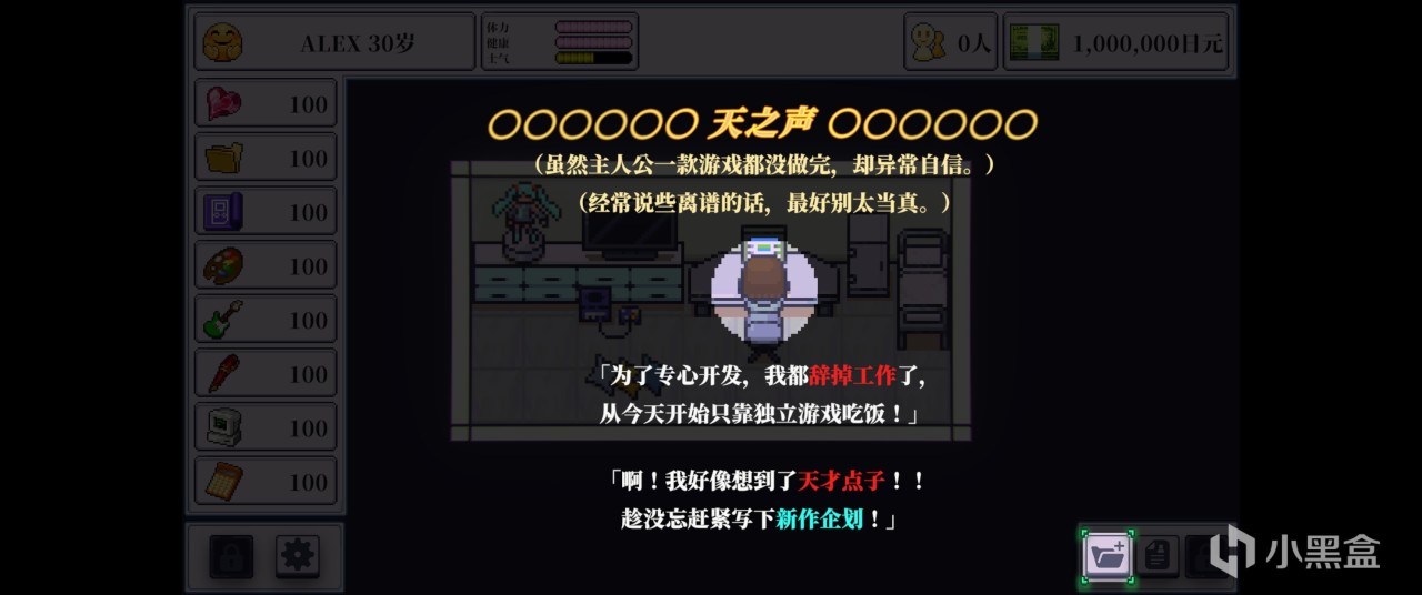 扮演一个30岁开始自己做游戏的独立开发者,demo一直能玩到35岁。一开始只用考虑开发进度,逐渐存款不支还得抽空兼职打工,后面还得分配时间打扫屋子健身和娱乐来调整状态免得状态崩掉,偶尔会有一些随机正面负面的事件,反正我是到结束也一个游戏都没搓出来。
