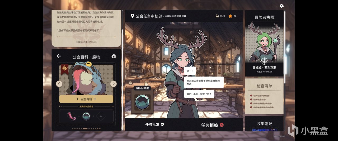 一款paper please游戏,主角是冒险公会的任务审查员,每天会有各种冒险者拿着委托和自己打到的怪物素材来交任务。而你则要检查任务时限过没过期,冒险者许可过没过期,并对照怪物图鉴来判断冒险者带来的怪物素材是不是委托指名的怪物。