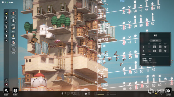 另外随着高度的发展,每个区段都会面临不同的问题,新的天灾,以及区域的优势。例如最低的风沙区,虽然时不时会把人吹走,但沙土的产量大。往高几层后会进入雾气区,这里没有风沙的袭扰,并且很适合收集水分,但能见度低居民需要照明,也开始需要照顾居民的恐高情绪。再往上还有demo没开放的雨水区,冰雪区,晴空区,星空区,显而易见还会有暴雨暴雪暴晒等新的天灾需要应付。