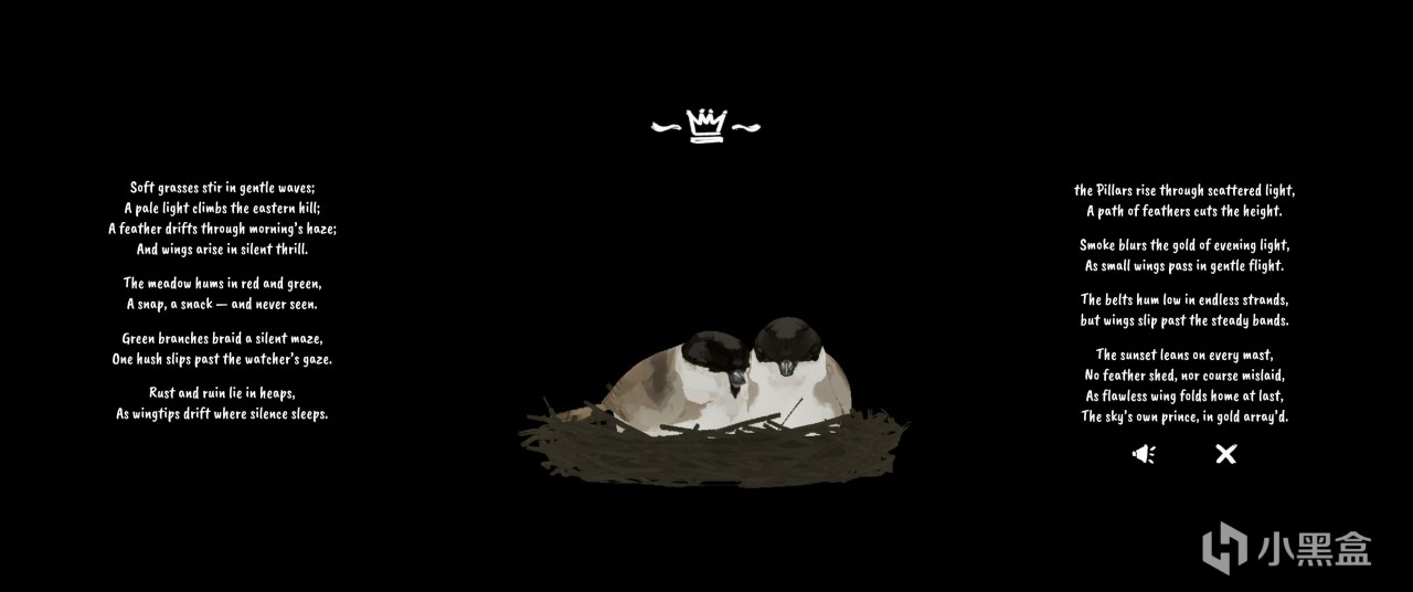 游戏的内容是作为一只褐头山雀飞过一个又一个场景,躲过场景中的猫头鹰、鱼、风扇叶片等危险,最终回到巢内与另一只山雀团聚的故事。非常简短,每个场景只用操作一下,躲过危险或是没躲过都没有关系,无论如何最后都会到达终点,并出现完整的一篇小诗。