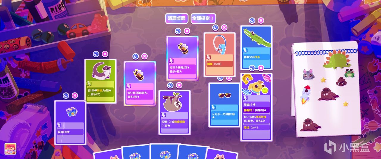 非常童趣可爱的卡牌对战肉鸽,最大特色是所有卡牌的效果都能自定义搭配。空白的卡片本身是没有任何效果的,但每天结束时可以用收集到的各种贴纸贴在卡牌上,每种贴纸都有各自的效果和费用,虽然可以把强力的效果都堆在一张牌上,但也会导致费用高到难以打出。因此需要合理搭配才能发挥最好的整体卡组效果,例如一张牌上先贴养三条鱼再贴海豹最多吃三条鱼加三分,觉得2费太高再贴个糖果降费,一张牌就能自给自足。