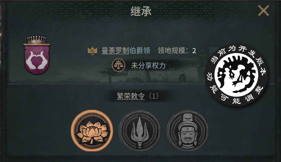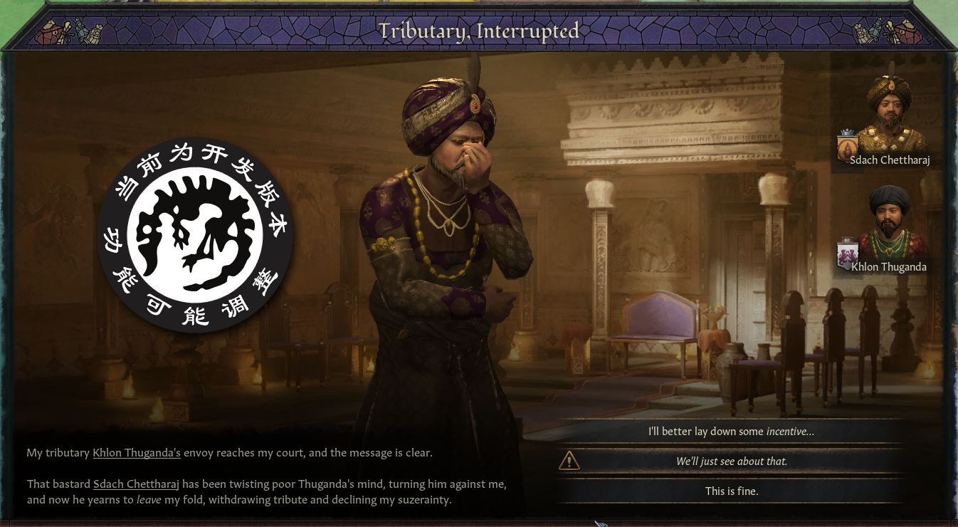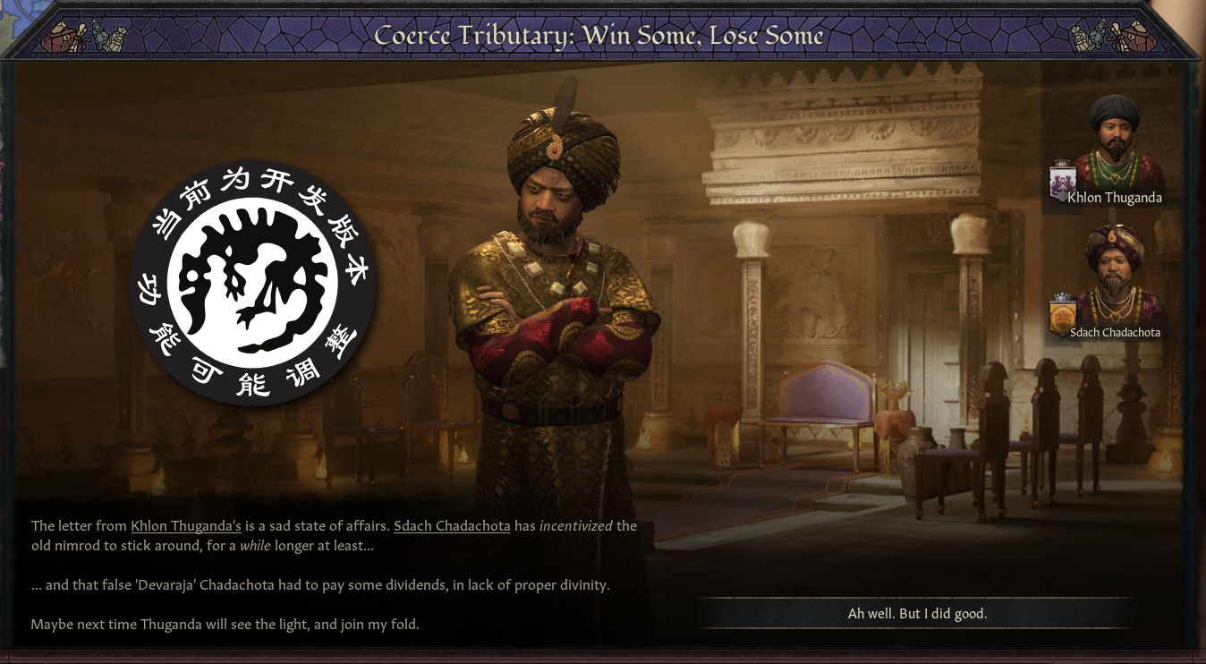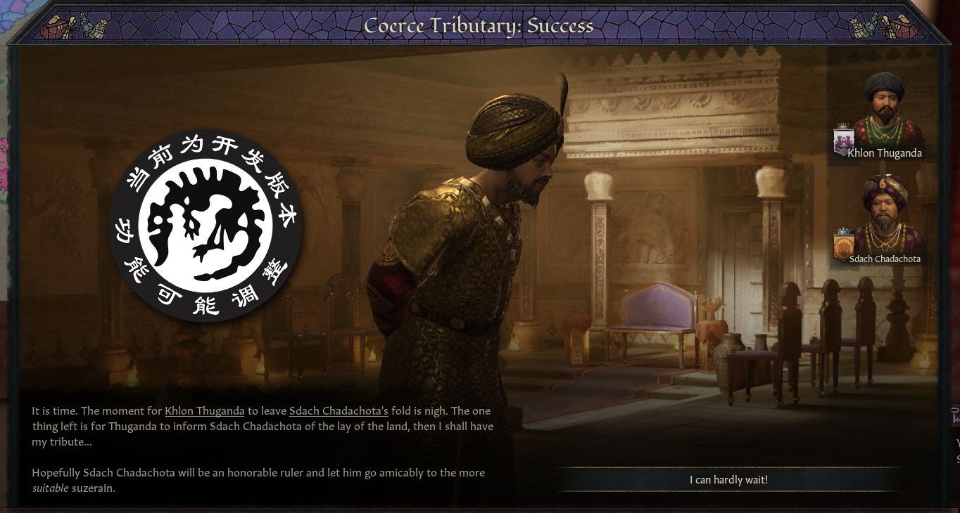 最後對模組作者說幾句。霸權/天朝變體的朝貢類型如今標誌着我在CK2中實現的五種不同類型(曼荼羅朝貢者是「溥天之下」發行後中的第六種)。我一直驚歎於這個系統的靈活性,它允許你構建不同類型的領地關係,其與封建制的領主/封臣關係截然不同。