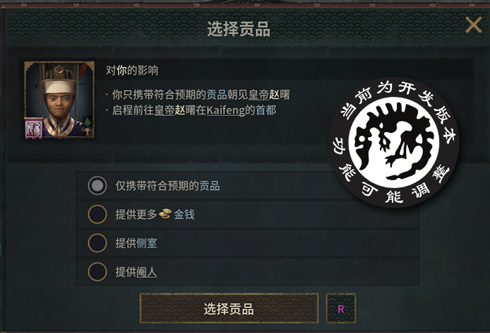 • 作爲計時器,計算朝貢頻率;如果踩着最低標準並等到最後一刻才入京納貢,皇帝可能會開始要求更頻繁的朝貢。高度成功的朝貢任務會給予更長的朝貢要求寬限期。