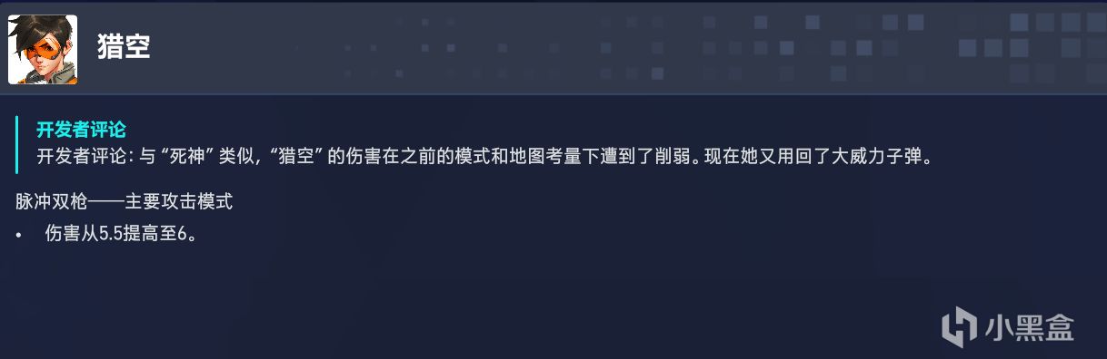 開發者評論: 開發者評論:與“死神”類似,“獵空”的傷害在之前的模式和地圖考量下遭到了削弱。現在她又用回了大威力子彈。
