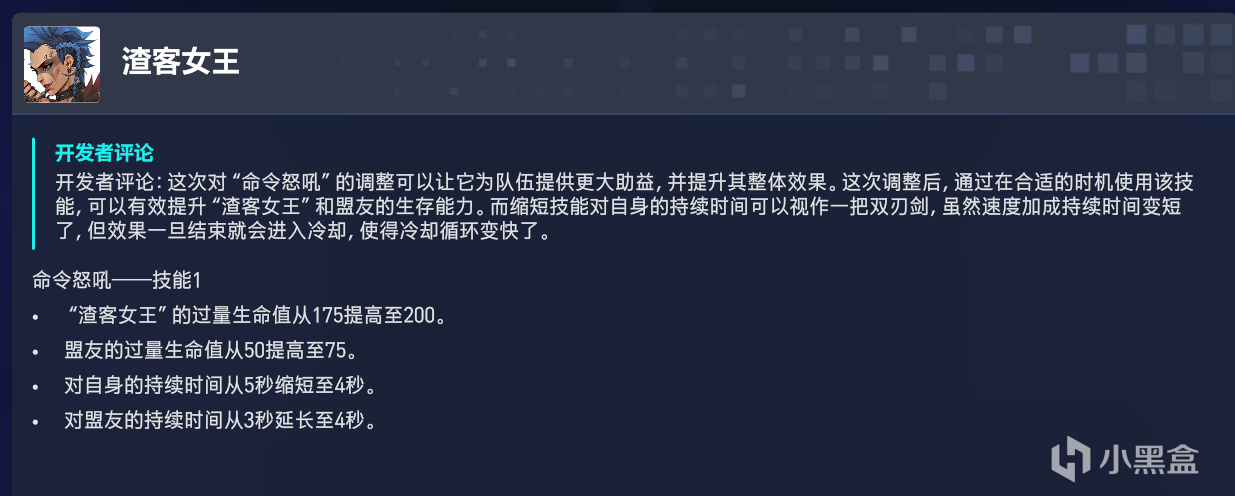 開發者評論: 這次對“命令怒吼”的調整可以讓它爲隊伍提供更大助益,並提升其整體效果。這次調整後,通過在合適的時機使用該技 能,可以有效提升“渣客女王”和盟友的生存能力。而縮短技能對自身的持續時間可以視作一把雙刃劍,雖然速度加成持續時間變短 了,但效果一旦結束就會進入冷卻,使得冷卻循環變快了。