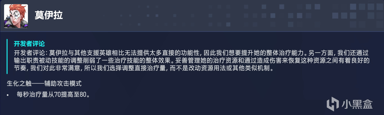 開發者評論:莫伊拉與其他支援英雄相比無法提供太多直接的功能性,因此我們想要提升她的整體治療能力。另一方面,我們還通過 輸出職責被動技能的調整削弱了一些治療技能的整體效果。妥善管理她的治療資源和通過造成傷害來恢復這種資源之間有着良好的 節奏,我們對此非常滿意,所以我們選擇調整直接治療量,而不是改動資源用法或其他類似機制。