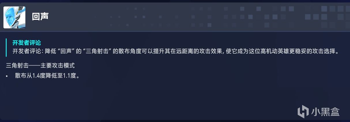 開發者評論: 降低“回聲”的“三角射擊”的散佈角度可以提升其在遠距離的攻擊效果,使它成爲這位高機動英雄更穩妥的攻擊選擇。三連發 (主要攻擊模式)