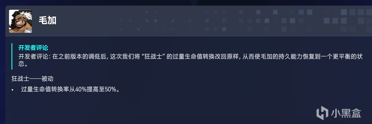 開發者評論: 在之前版本的調低後,這次我們將“狂戰士”的過量生命值轉換改回原樣,從而使毛加的持久能力恢復到一個更平衡的狀 態。
