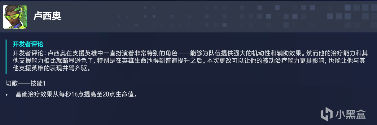 開發者評論: 盧西奧在支援英雄中一直扮演着非常特別的角色一—能夠爲隊伍提供強大的機動性和輔助效果。然而他的治療能力和其 他支援能力相比就略顯遜色了,特別是在英雄生命池得到普遍提升之後。本次更改可以讓他的被動治療能力更具影響,也能讓他與其 他支援英雄的表現並駕齊驅。