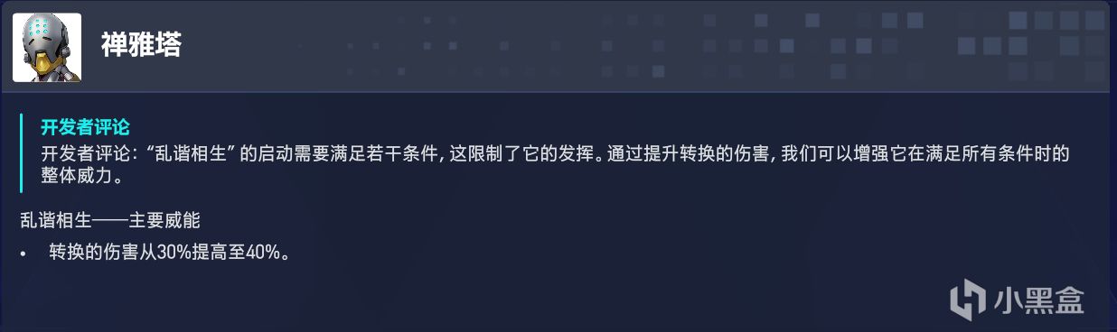 開發者評論: “亂諧相生”的啓動需要滿足若干條件,這限制了它的發揮。通過提升轉換的傷害,我們可以增強它在滿足所有條件時的 整體威力。