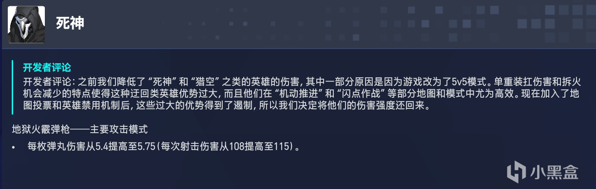 開發者評論:之前我們降低了“死神”和“獵空”之類的英雄的傷害,其中一部分原因是因爲遊戲改爲了5v5模式。單重裝扛傷害和拆火 機會減少的特點使得這種迂迴類英雄優勢過大,而且他們在“機動推進”和“閃點作戰”等部分地圖和模式中尤爲高效。現在加入了地 圖投票和英雄禁用機制後,這些過大的優勢得到了遏制,所以我們決定將他們的傷害強度還回來。
