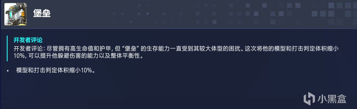 開發者評論: 儘管擁有高生命值和護甲,但“堡壘”的生存能力一直受到其較大體型的困擾。這次將他的模型和打擊判定體積縮小 10%,可以提升他躲避傷害的能力以及整體平衡性。