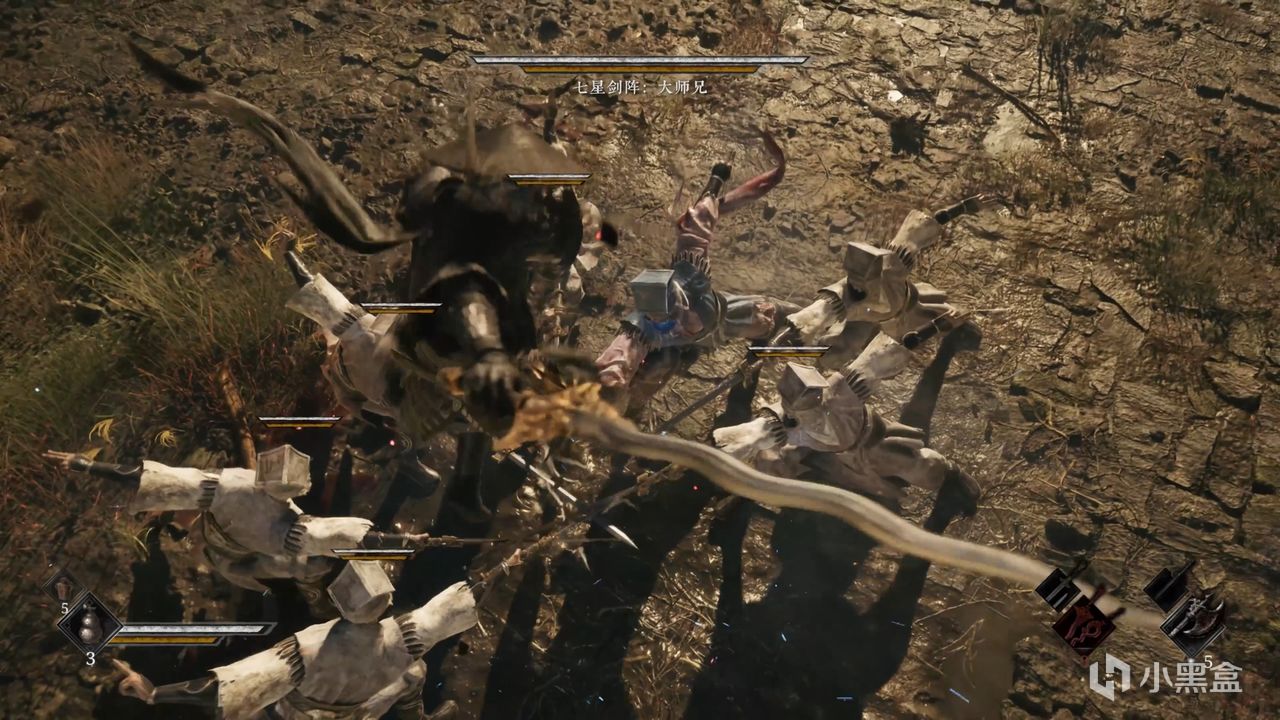 二阶段更有着反常规的操作,大部分动作游戏中的BOSS,更多会在造型上做文章,让玩家在体验的时候无法第一时间掌握非人类出招。而“七星剑阵”二阶段的大师兄,则是以吊挂的方式出招,非常不好把握切口点。相信看了不止一遍的玩家不在少数。那多角色同步操作,还有第二阶段“七星剑阵”大师兄的吊挂攻击,至少在老基德个人看来,是目前所接触的游戏中从未看到过的