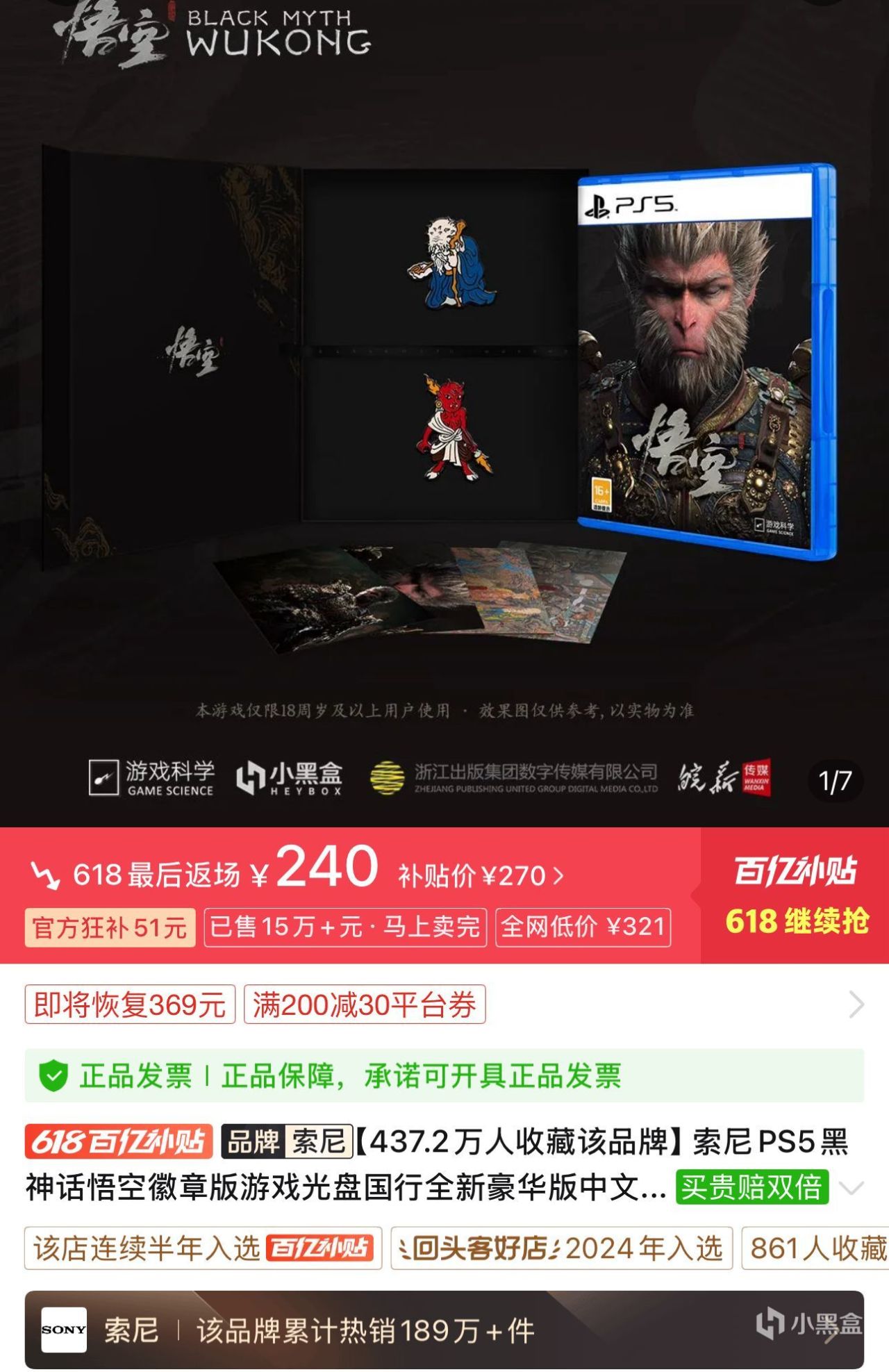 3.PS5游戏《大圣归来:黑化版》国行中文240全新包邮,需要使用免费领的积分兑换一个200-30的券才是这个价格,其最大价值应该是附属的特典徽章了,如果纯粹买来收藏不玩,可以等200全新包邮再买,性价比更高。